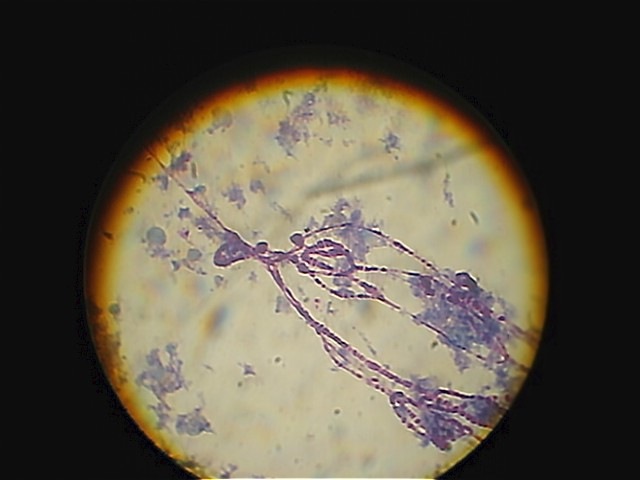 Las glándulas son de color blanco grisáceo y conviene separarlas perfectamente de la parte de fauces, que queden solas o lo mejor que se pueda, una vez hecho esto las depositamos en un portaobjetos con una gotita acético al 45%