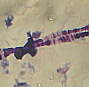 En los textos donde se describe este práctico recomiendan la orceína láctica, si se dispone de ella hay que poner una gota de colorante sobre el material y dejarlo 10 minutos luego un cubreobjetos, seguidamente se pone una servilleta de papel  sobre el mismo y con el pulgar se presiona fuertemente para disgregar el material (squash). En este tipo de coloración podrá observarse el bandeo de los cromosomas, adjunto una foto que me proporcionó la doctora Goni realizada con esta técnica