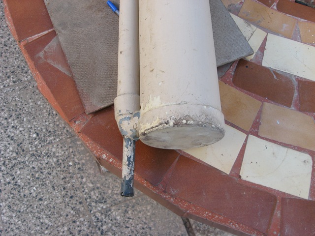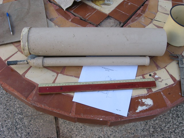 Para fabricarlo son necesarios tres caños de PVC uno de 10 cm de diámetro, otro de 3 cm y otro de 1 cm, los largos de cada uno están en el diagrama, además se necesitan dos tapas ciegas, una para el tubo de 10 cm y otra para el de 3 cm y un codo para el caño de 3 cm al que debemos perforar para que entre el caño mas fino.