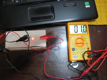 Los leds fueron alimentados con dos pilas de 1.5v, puede verse como varía el efecto fotoeléctrico con el color de la luz con el que se ilumina la lámina de metal alcalino, la frecuencia mas baja sabemos corresponde al rojo en 660 nm luego sigue la del verde en 560 nm y la mas corta de todas la luz negra o UV que en este caso ronda los 370 nm.