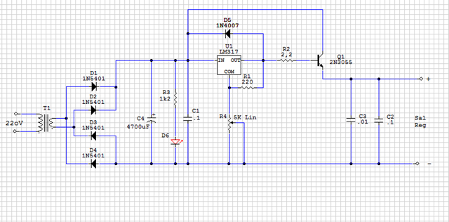 El diagrama de la fuente es básicamente el de este página, el tansformador que usé es de 6v 2A. Y el transistor final en lugar del 2n3055 usé otro que tenía.