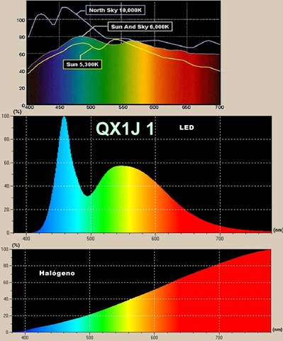 Como ilustración he conseguido los espectros de la luz solar, la luz blanca de led y la luz halógena