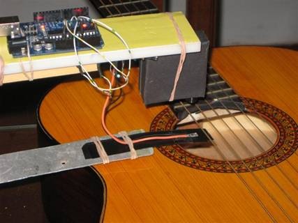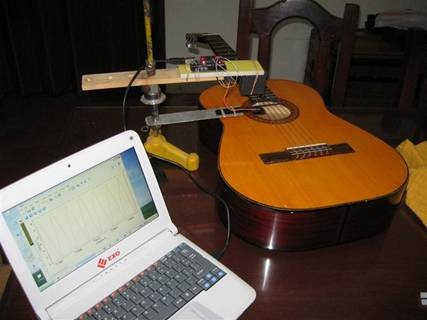 Aprovechando la barrera óptica que armé para medir la velocidad de la flecha, sin muchas variantes podemos hacer una buena prueba midiendo la frecuencia de resonancia de las cuerdas de una guitarra.