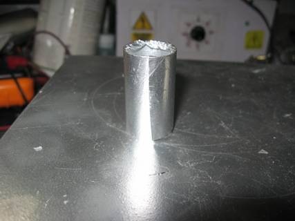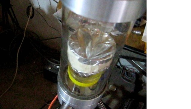 La onda de choque rompe el foil de aluminio y puede verse la luz de la explosión que sale por arriba del recipiente