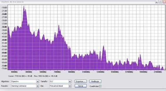 La siguiente imagen es el espectro de frecuencias y magnitud de las mismas, el ruido llega a los -15 Db