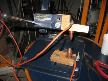 La prueba requiere de la confección de unos electrodos de cobre montados en una mecánica que los deje enfrentados, se uso en parte algo ya armado para este fin que presenté anteriormente este mismo blog (Una soldadora de puntos)