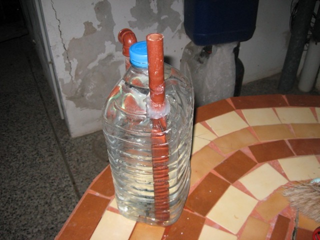 El bidón de 5 litros debe estar en perfecto estado sin rajaduras ni perdidas, se practican 2 perforaciones en el mismo, una arriba y otra a un costado como muestra la figura