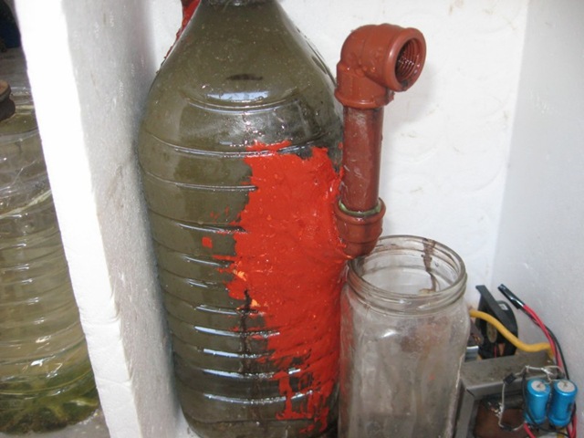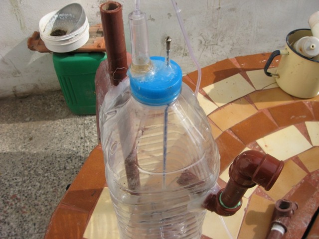 Se utilizan para la boca de entrada y la de salida caños de PVC de 0.5 pulgada, el caño largo abajo tiene un corte en chanfle, por el se ingresara el “alimento”, llega hasta el fondo, el caño de salida donde se obtendrá el liquido digerido que se usa como abono esta hecho con dos codos y unos trozos de caño,  para unir y dejar estanco el recipiente, usé una pistola de soldar plástico, y arriba de eso con silicona (Silastic 732 rtv) es fundamental que no tenga perdidas, como en mi modelo había algunas perdidas usé silicona para sellar todo