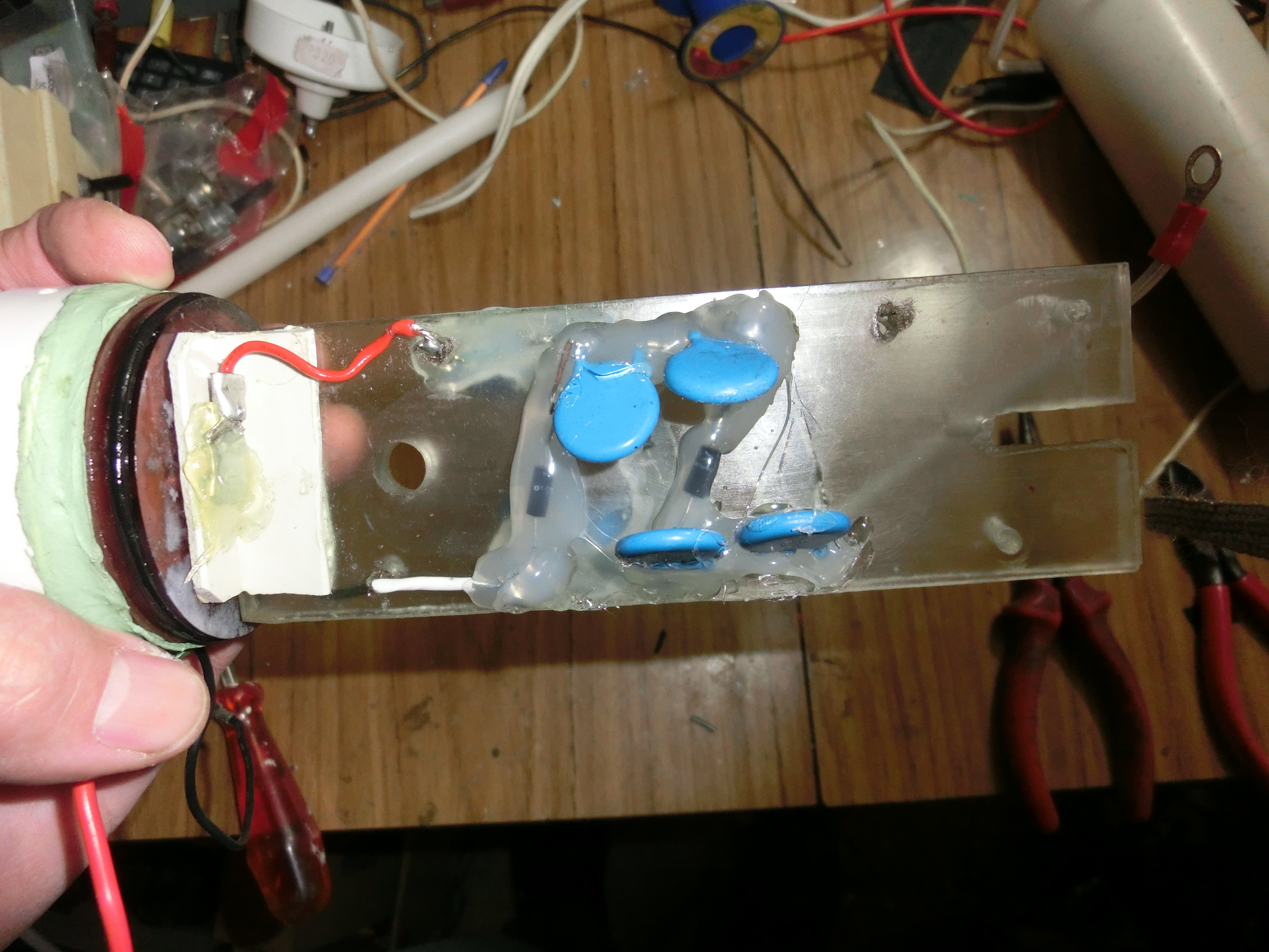 En esta imagen pueden ver el cockroft walton  ya armado sobre una plancha de acrílico, una vez armado el multiplicador conviene cubrir todo con plástico de la pistola