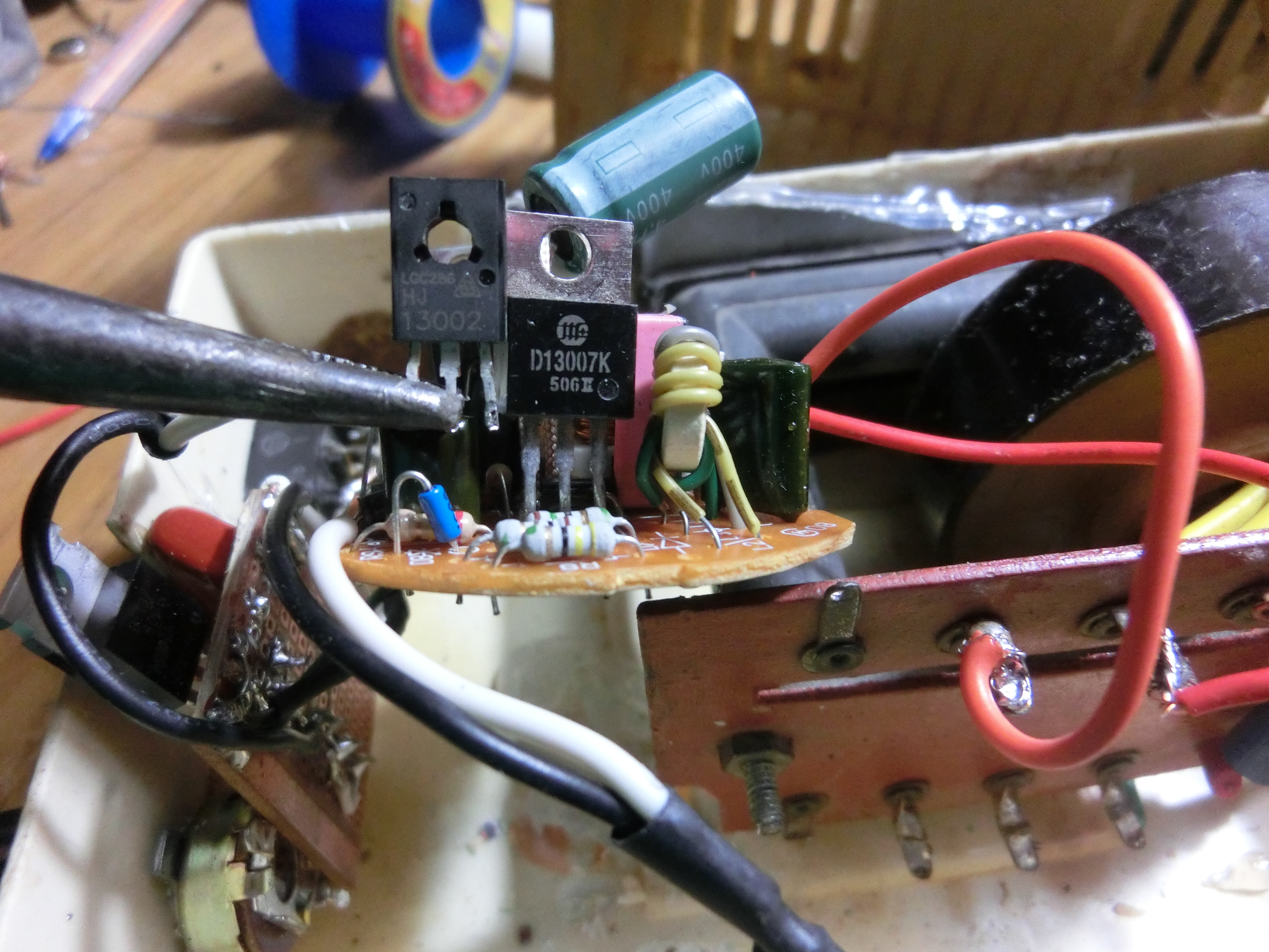 La segunda etapa es la electrónica de una lámpara ahorradora, estas electrónicas vienen con un par de transistores HJ 13002 como resultan bastante pequeños tendremos que cambiarlos por otros mas robustos, elegí los D 13007, que son los que traen las fuentes de PC, desoldamos entonces los dos HJ 13002 y soldamos en su lugar los D 13007 en la misma posición y nos quedaré lista la segunda etapa. Créanme que he probado directamente con los transistores que trae, pero duran unos minutos y se terminan fritando, un arreglo posible es dejar los transistores y colocar un par de disipadores de aluminio, pero lo mas sano es cambiar como les he comentado