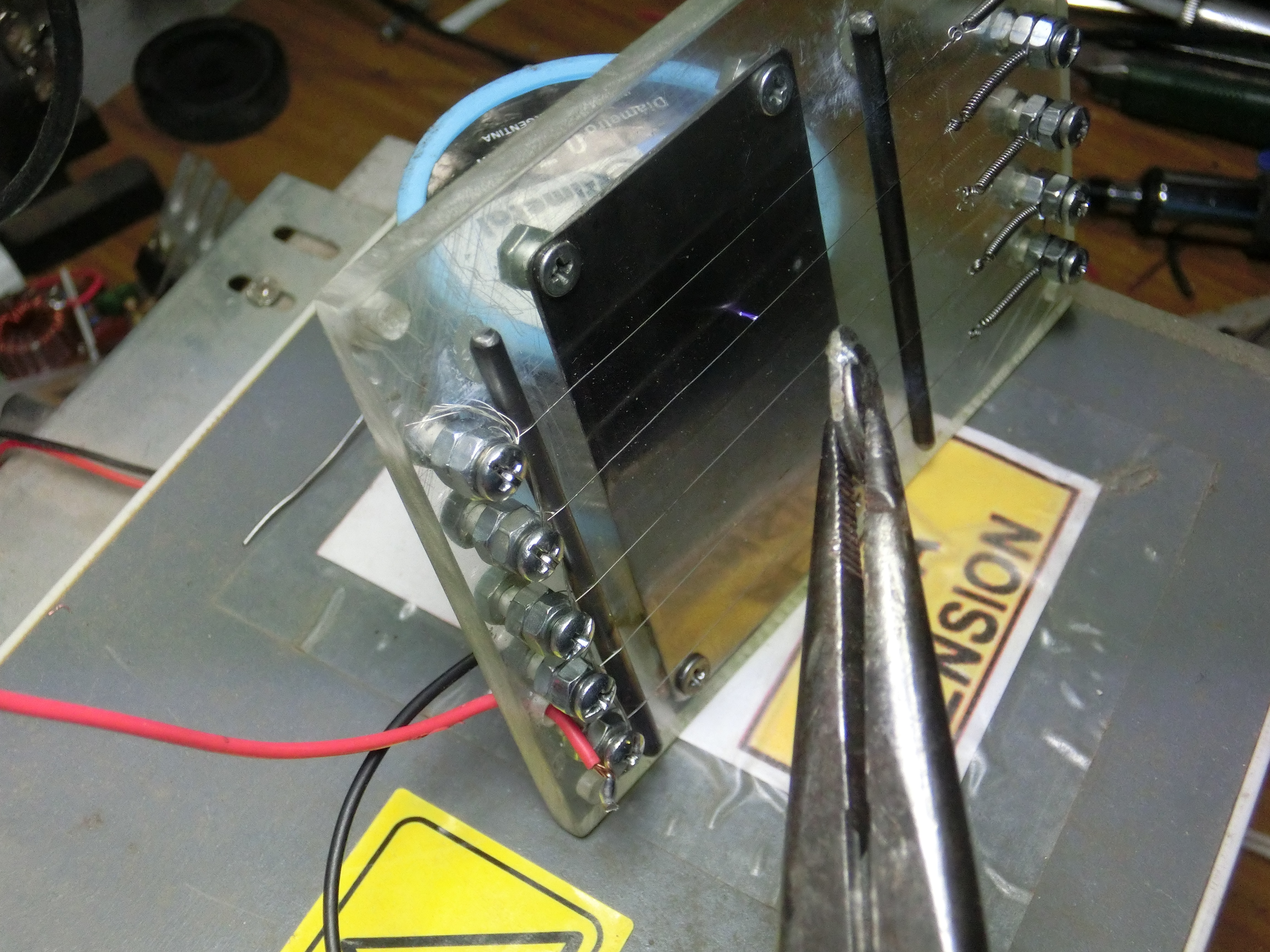 El experimento es muy simple, hacemos un rollo con el papel usando un lápiz como molde y encendemos uno de los extremos con un encendedor y llenamos el recipiente de humo una vez que colocamos la tapa superior conectaremos a la base del recipiente el negativo de la fuente, uso para el experimento la fuente de alta tensión del lifter, ahora con un electrodo conectado al positivo vamos a tocar la placa superior del recipiente y magia… desaparece el humo, si usamos este tipo de fuente hay que tener cuidado porque una descarga puede resultar peligrosa.