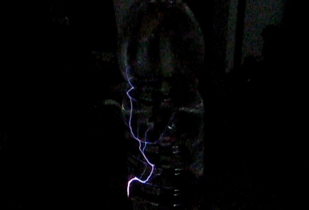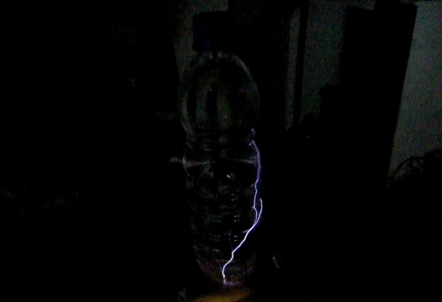 Motivado por una discusión en el foro de científicos aficionados, http://www.cientificosaficionados.com/foros/viewtopic.php?f=7&t=13765 estuve haciendo algunas experiencias con el generador de Van Der Graaff, la idea era poder registrar chispas lo mas largas y brillantes posibles, en un momento se me ocurrió colocar una botella plástica con agua directamente sobre la esfera (En mi caso parece un huevo mas que una esfera ya que es un viejo sifón de acero inoxidable), la experiencia es muy buena, agrego fotografías y un video, me dejó asombrado el experimento.