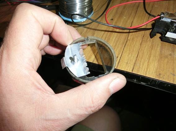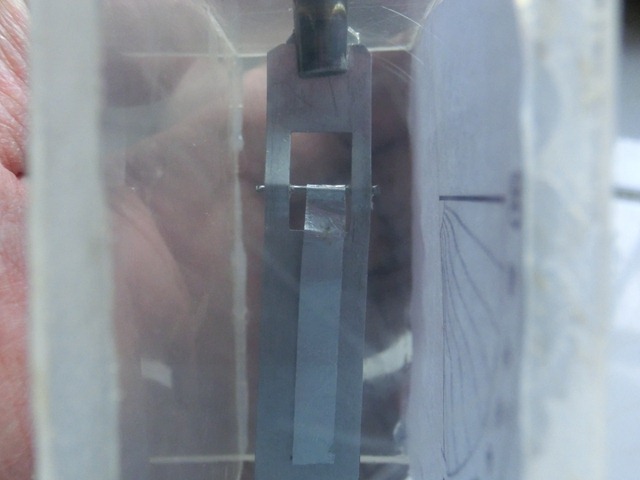 En la imagen puede verse la forma que esta hecho, una chapa de un milímetro de espesor que esta fija y se le practica un agujero en forma de rectángulo de 7 x 10 mm que no esta perfectamente en el centro sino desplazado. Se corta la cánula de una aguja hipodérmica y se pega con cianoacrilato en medio del rectángulo, la lámina móvil debe ser de papel aluminio del que se usa en la cocina (foil) tiene un largo de 4,5 cm y un ancho de unos 4 mm, se dobla en una de las puntas en forma e U y se forma una especie de bisagra con la cánula de aguja que esta pegada a la chapa mas gruesa.