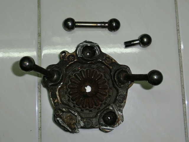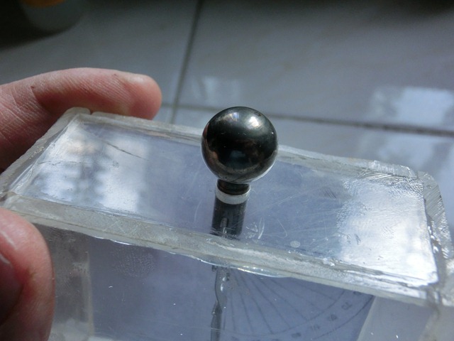Ese mecanismo esta conectado a un electrodo superior, que es una esfera metálica perfectamente pulida, en mi caso he usado algo que encontré en la chatarra, no se que habrá sido antes, pero se adapta muy bien, en el vídeo hay mas detalles, pueden usarse los pomos que se se usan en terminación de muebles que también son esféricos y otra opción es con la piedra rebajar una bolita de acero y soldar un clavo.