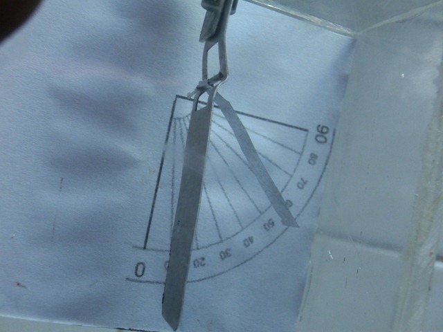 Justo el vértice del ángulo debe coincidir con el eje de la bisagra que forma el mecanismo del electroscopio