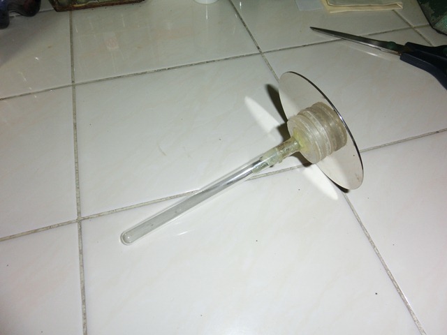El mango se pega con cemento de dos componentes y puede ser de vidrio, un tubo de ensayo viene muy bien.