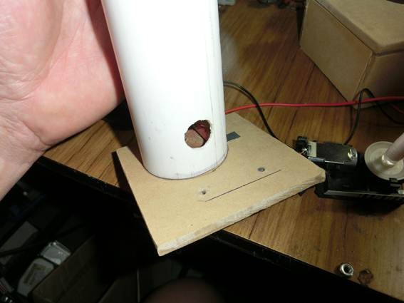 El eje plástico esta recubierto de cinta de teflón de la que se usa en fontanería. El tubo de PVC es de 2 pulgadas de diámetro y tiene un largo de 23 cm. Va encajado en un taco de madera que esta pegado a la base que mide 10×10 cm,