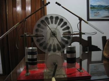 Es un experimento sencillo que causa impacto, es una aplicación del experimento anterior, se corta un huso de aluminio en el centro se coloca algún soporte para que pueda girar libremente y se doblan las puntas una hacia arriba y la otra hacia abajo. Luego se afirma una aguja en forma vertical sobre la esfera y en el extremo se coloca la hélice, se da marcha al generador e inmediatamente de produce el movimiento.