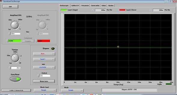 Si bien tiene una ventana donde se puede variar la resolución, he probado y solo consigo lecturas con resolución de +/- 10Hz asi que vamos a tomar una lectura bruta de donde esta resonando colocando la abertura de la caja justo delante del micrófono de la PC y le daremos un golpe al diapasón para que vibre, esto nos dará una lectura que tendrá un error de +/-10 Hz, para obtener lectura debemos poner en marcha el osciloscopio con el botón de encendido y apagado que esta en la esquina superior izquierda.