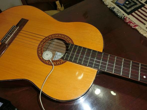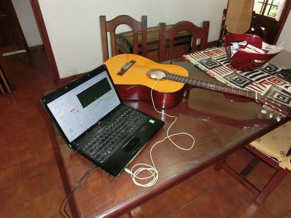 Luego colocamos el micrófono dentro de la caja de la guitarra y hacemos sonar la primera cuerda ajustando o soltando la clavija hasta tener la frecuencia que indica la tabla, ahora hacemos el mismo trabajo con la segunda, la tercera, la cuarta y la quinta, en la sexta puede que el