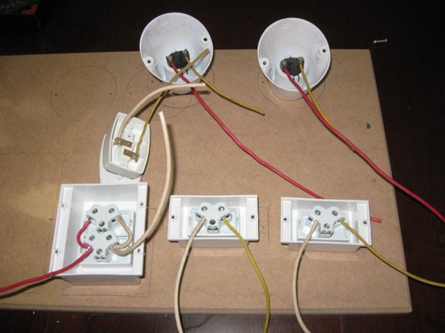 En esta puede verse que he unido todos los del mismo color que van a los 220, el rojo y el blanco en este caso y los amarillos van a los focos y resistencias