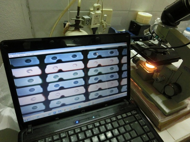 Los que trabajamos en la docencia y queremos enseñar a nuestros alumnos como se ve con el microscopio a veces nos encontramos con el problema que en el laboratorio solo hay un microscopio o dos y tenemos 15 o 20 alumnos y eso… es un problema, mientras uno esta mirando los otros 19 están jugando con el cráneo del muerto, o pegándose con el fémur.