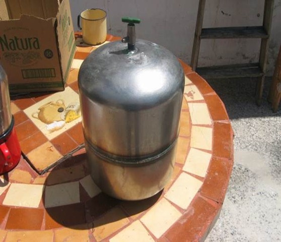 Uno de los chicos con removedor quitó la pintura verde y la manija superior además pulió la garrafa.