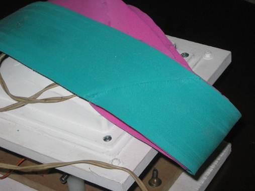 Esta hecha de foami, gomaeva como se la conoce en argentina, si bien no es muy fuerte dura bastante tiempo, el problema mas grande es que se desgasta en los bordes y ensucia de partículas que se pegan en el interior del caño que hace de soporte, otro problema es que al ser medio esponjosa retiene bastante la humedad. La banda de este VDG es de dos colores, no alcanzó una sola plancha de foami, se pega muy bien con cianoacrilato. Las uniones van en chanfle. El ancho es de 8 cm